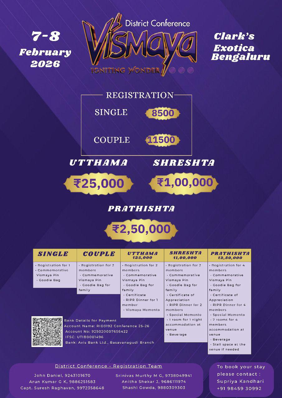 Rotary International District 3192 consists of 4 revenue district that is part of Bangalore Urban and Rural, Mandya, Tumkur and Chikkaballapur. The district 3192 is divided into 6 zones with 87+ Clubs. We are blessed with 3400+ Rotarians. Today we stand strong with 151 Rotaract Clubs and 5200+ energetic Rotaractors.